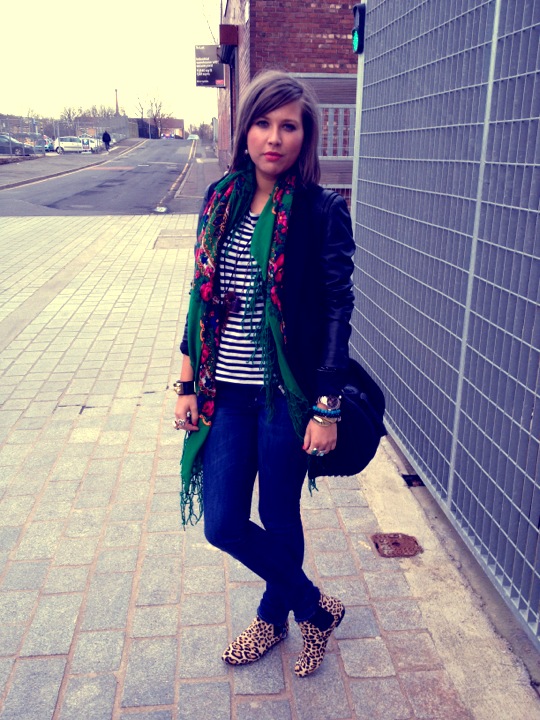 Love the floral scarf and leopard flats