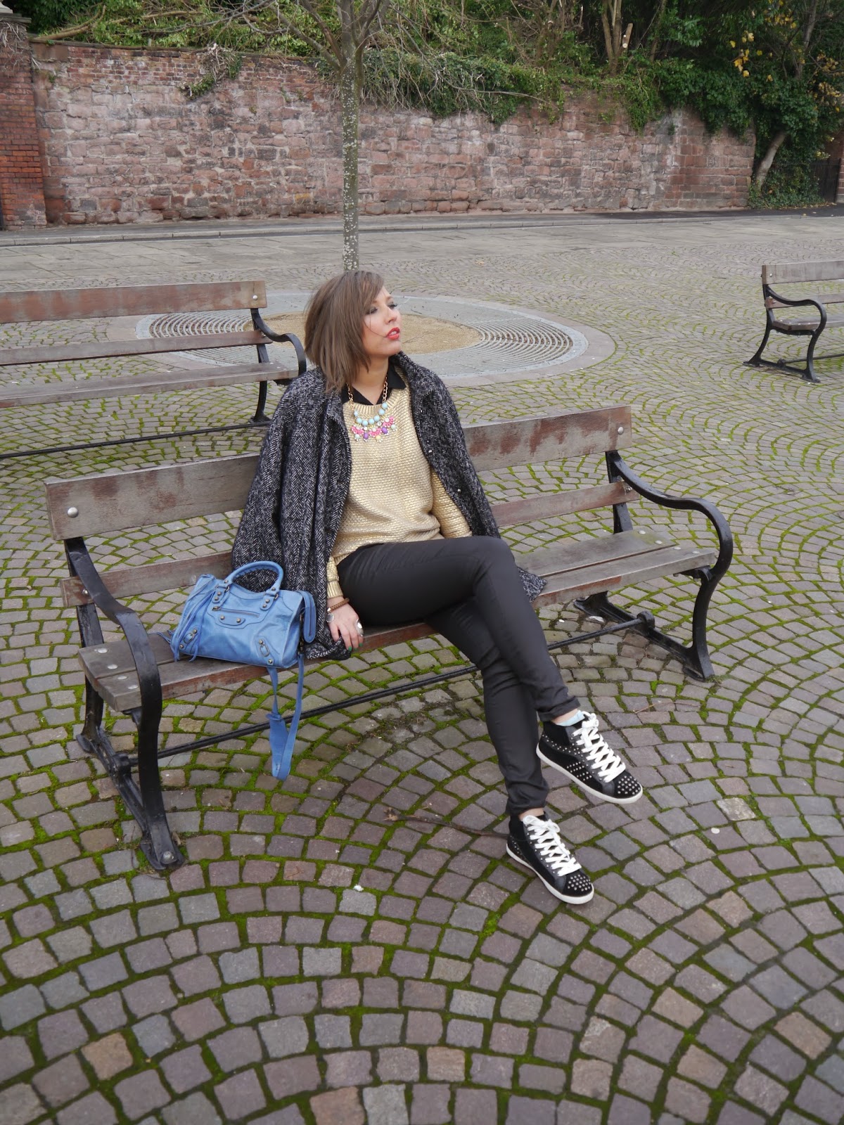 Its December!!Hello wintery, cozy days . We went to beautiful Chester last weekend for a Sunday Traditional tea. I love this small town and how historical it looks. Especially in December all small towns in UK looks beautiful and very Christmasy with all the Christmas lights and markets . We shoot my OOTD at the beautiful park by the river .I’m wearing sold out gold jumper from H&M, Zara leather jeans , Steve Madden studded sneakers and my vintage Balenciaga .I hope you all are very exited for the holidays ahead? My music today to get you all in a Festive spirit the one and only tune that i listen every year is…… Wham! Last Christmas of course .