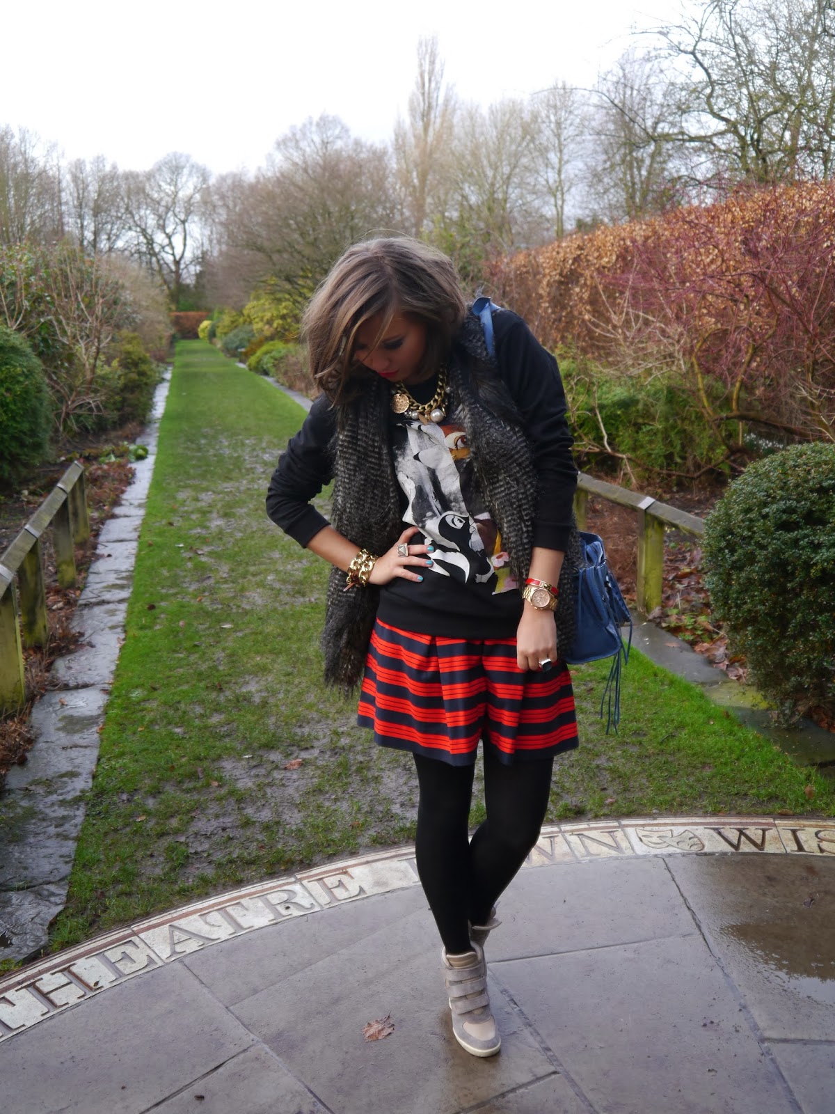 Well, look at this awful weather we all having? Its perfect time for blogging ! My today’s girlie look is very simple .This Bambi jumper is a Primark answer to Givenchy long sleeved Bambi sweatshirt which was a big hit with celebrities last year .The Fur gilet I bought two years ago in Peacocks, the shop that sadly doesn’t exist any more in MCR. Next is my skirt which represents a major fashion trend right now – Scuba Wear. Such a versatile peace…I got it in Gap SS14 collection .The bag is a Classic Balenciaga mini city bag.
