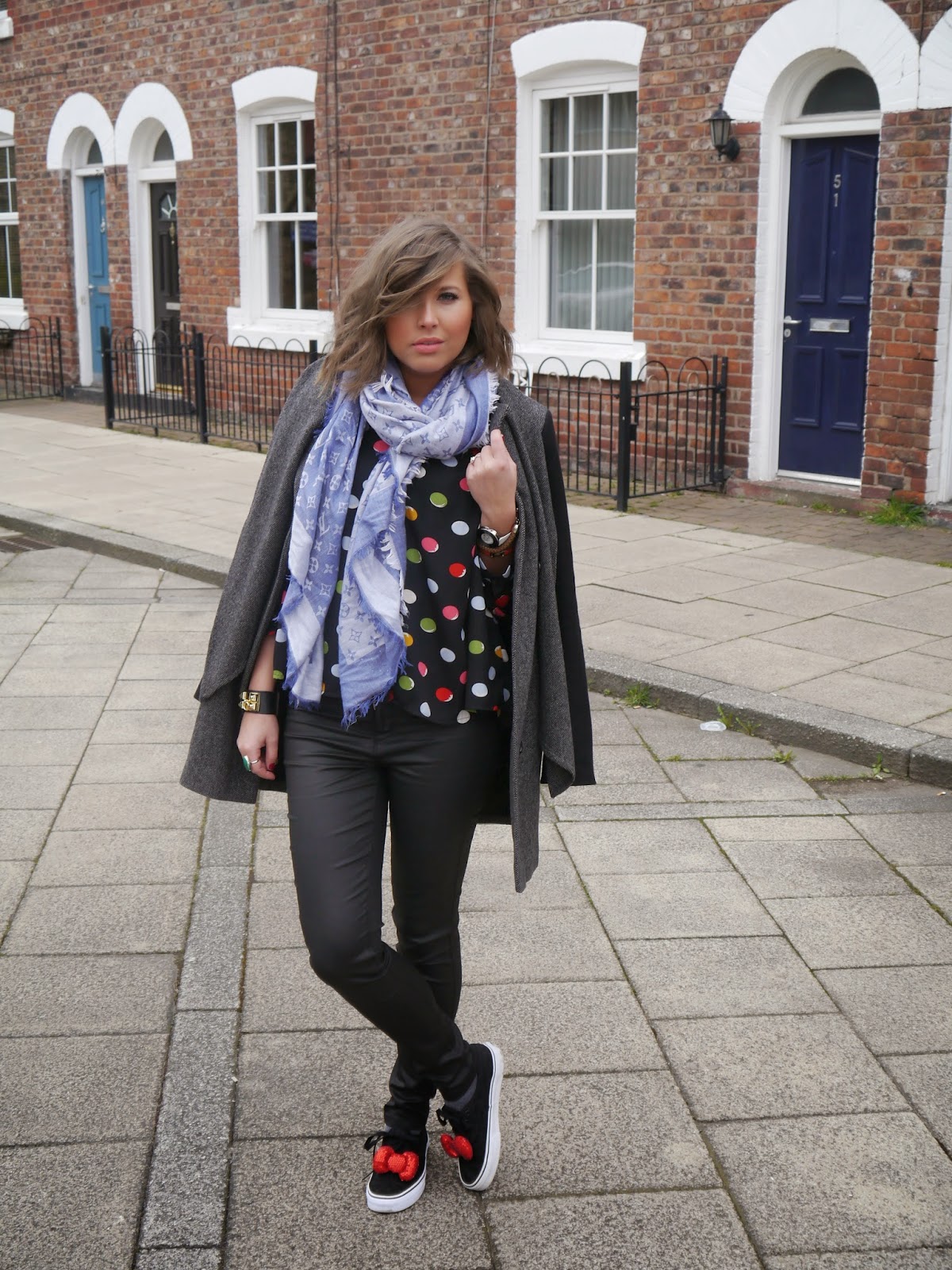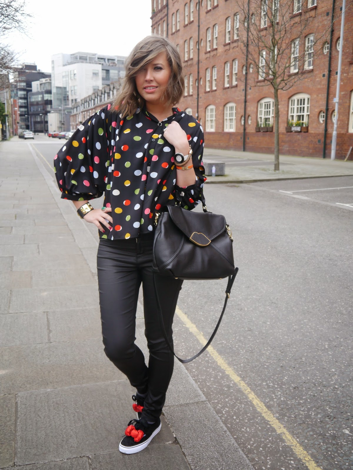 Well, hello my lovely readers. Today I want to blog about my new Lulu Guinness bag . I have been a massive fan of Lulu bags for quite some time now so when I visited her boutique and found myself surrounded by her latest bag collection a life-depending decision was made in seconds – I am not leaving without a bag! The second decision was to pick The One. I was almost hallucinating floating in the sea of gorgeous bags which colourful lips seemed to be smiling to me from the shelves: : Buy me! Buy me! But when I saw this black little masterpiece with a shoulder strap (which I always see as a massive bonus) I almost cried from happiness – it was just perfect. This is the softest leather bag I have ever owned, also, Lulu’s bags shapes and elements are incredibly elegant and very different from other bag designers, who were more ” generic” and conventional in the recent years. In my today’s outfit I debut my polka dots blouse, which I got from H&M a while ago as I was preparing for my live gig but eventually never worn it. It has absolutely brilliant”bat wings” sleeves! Its so bright and colourful, just ideal for colouring up grey rainy days in Manchester. My shoes represent a very successful collaboration of VANS and Hello Kitty. Theirs red, glittery bows add a unique twist to classic VANS . I really hope you all like my look, please comment and follow me! Speak soon