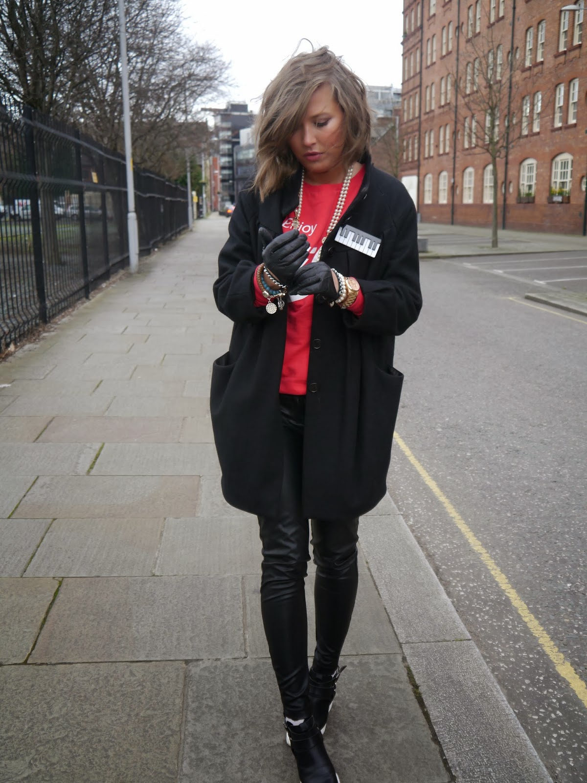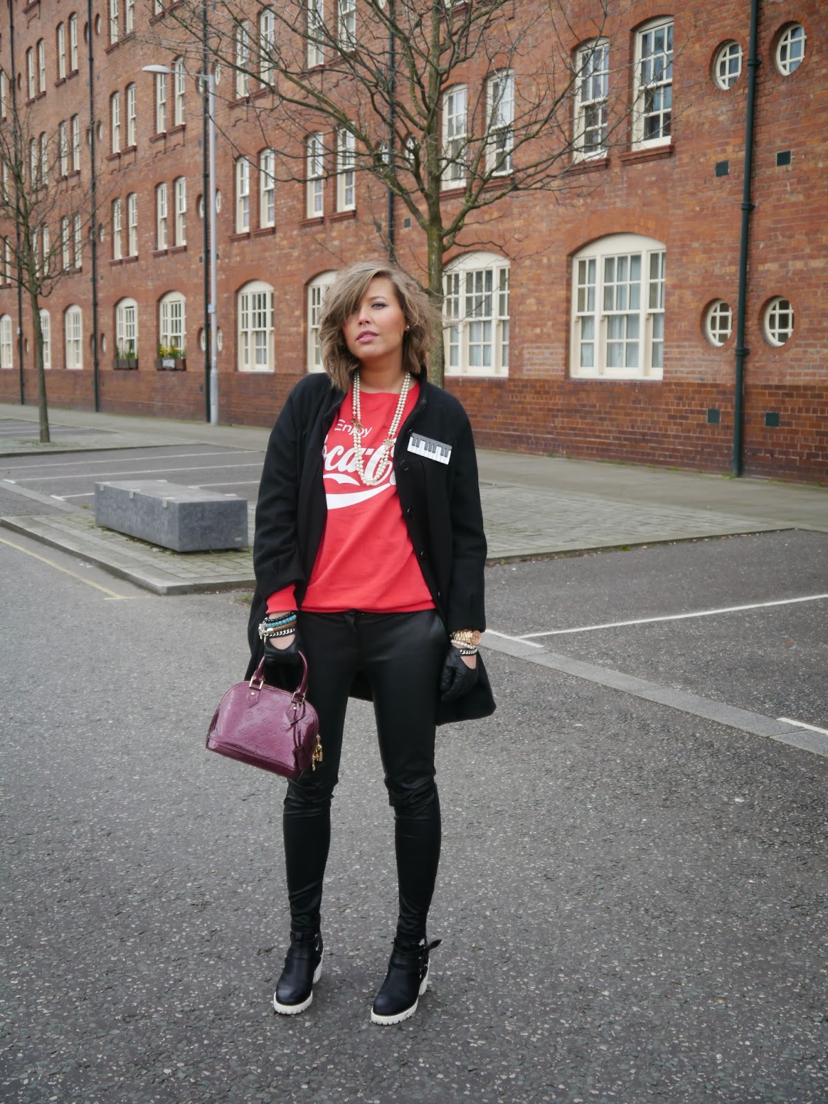 Лого больших брэндов на майках и джемперах, трэнд так ярко характеризующий эпоху 80-х, опять в моде. Мой джемпер” Enjoy Coca-Cola” я купила в Primark , мне сильно повезло, так как в Манчестере они были распроданы за несколько часов! Мои кожаные брюки с ” мокрым” еффектом – представитель еще одного трэнда ” рокерских” 80-х – из Zara. Чтобы добавить немного тепла и света в мой довольно “мрачный” зимний наряд я решила использовать красочный русский платок, напоминающий о скорой весне, которая, боюсь, посетит Англию совсем не скоро..