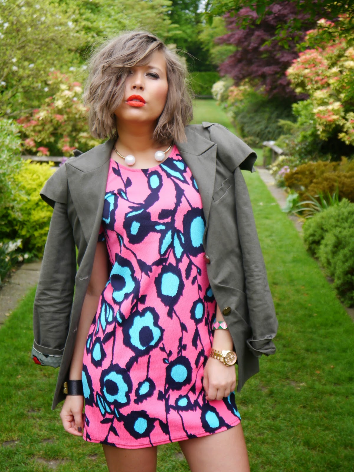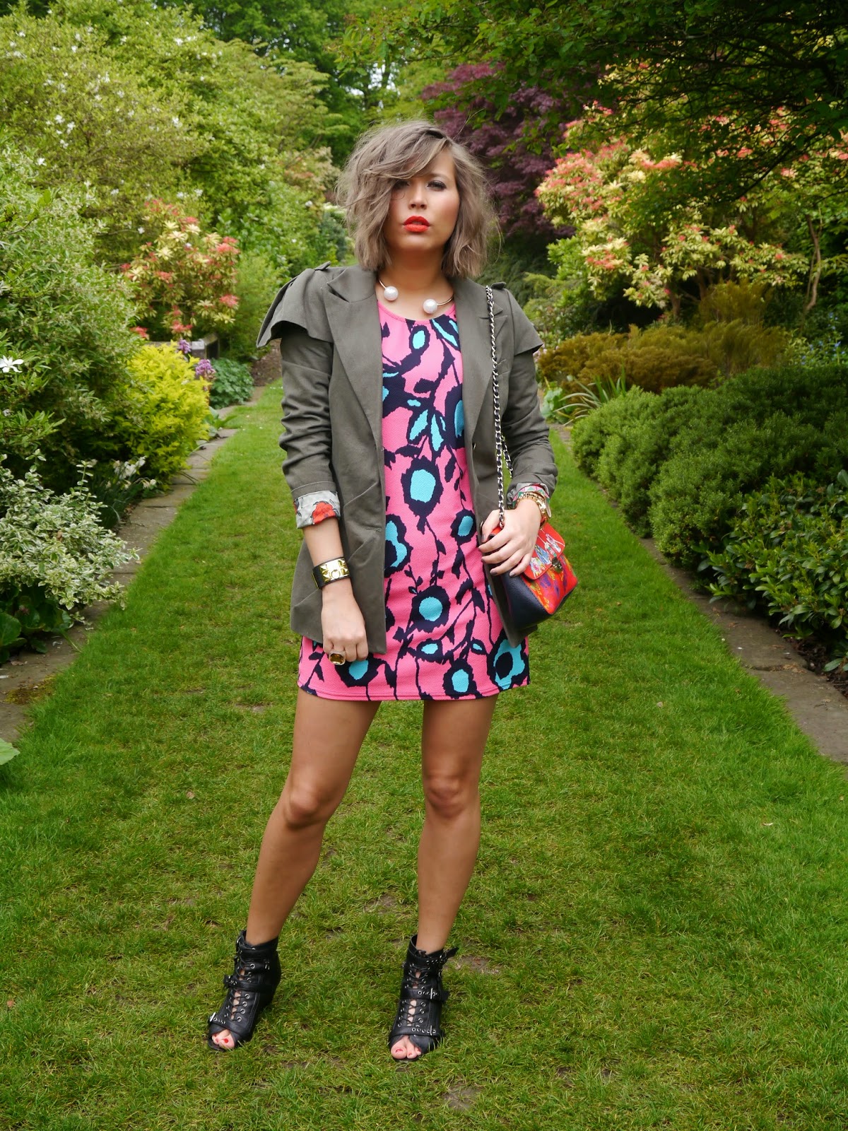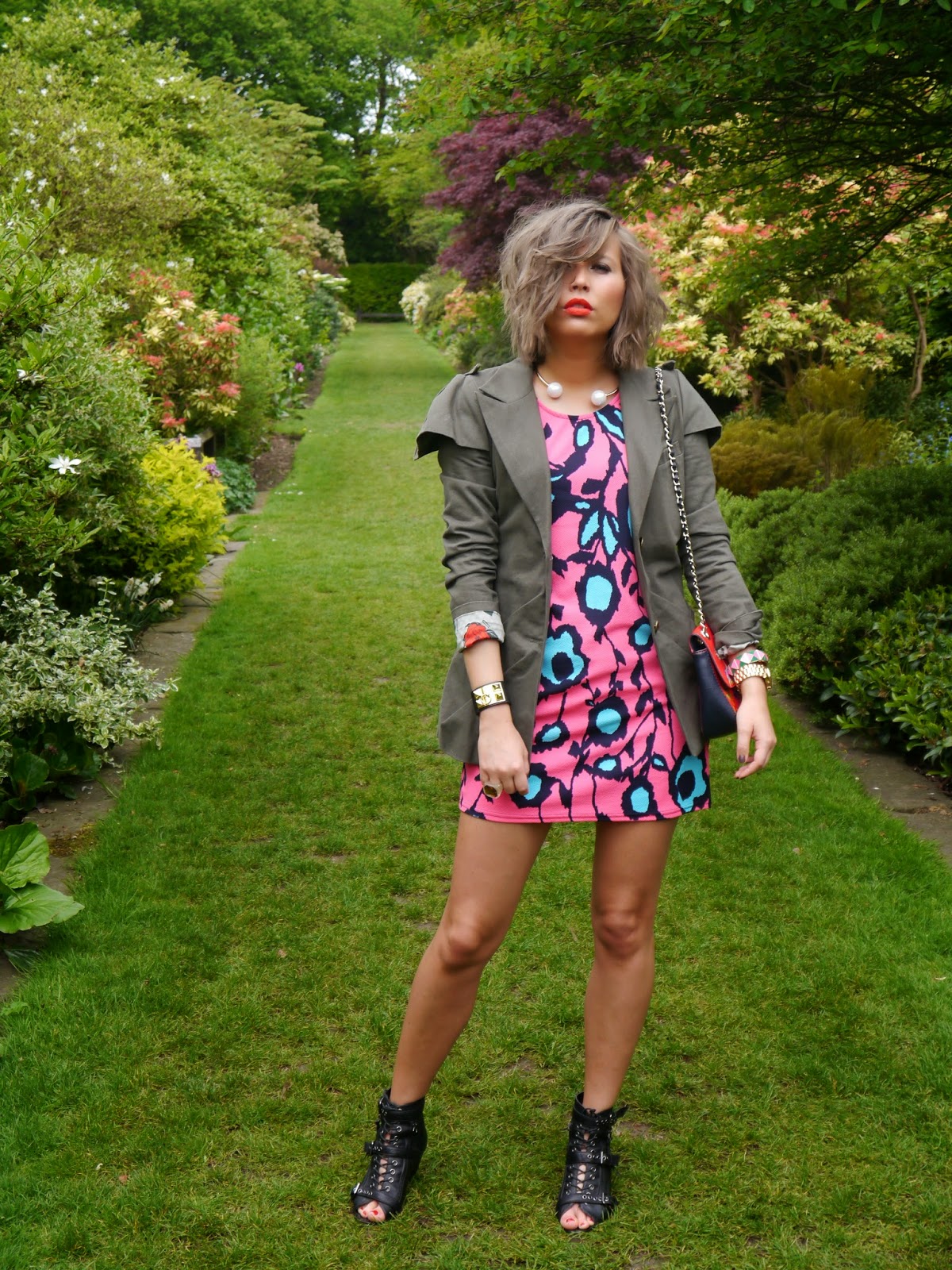 Это платье мгновенно “нарушило” серость нашей традиционной майской погоды своим контрастным цветочным принтом, который в сочетании с невероятно нежной структурой ткани придал моему луку весенней свежести и лёгкости. Оставаясь приверженцем рок чик стиля в любое время года, я решила добавить немного ” агрессивного драйва”, смешав люминисцентные цвета платя с холодным хакки жакета с Лондонского винтаж маркета и ” гладиаторской платформой” Kurt Geiger Carvela туфлей. И, конечно же, хит этого сезона – коралловая помада Lady Danger от MAC – идеальное завершение моего наряда!