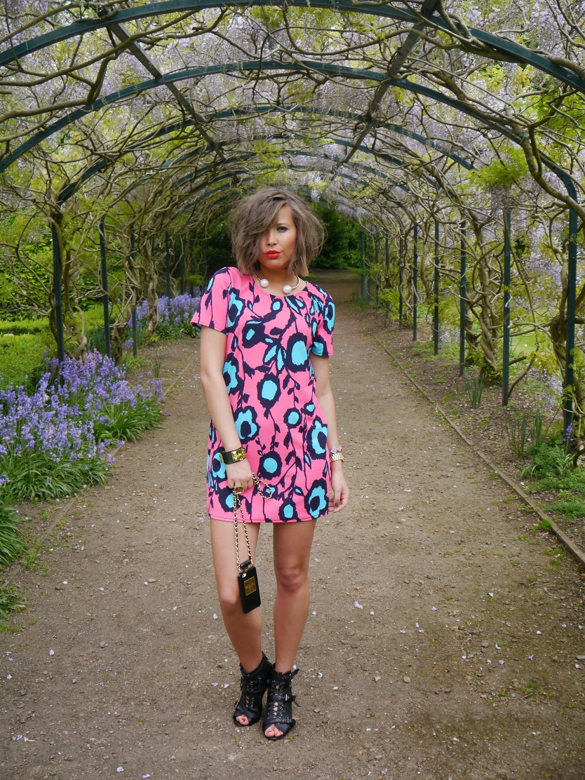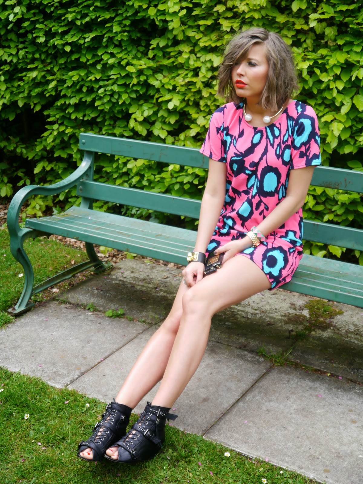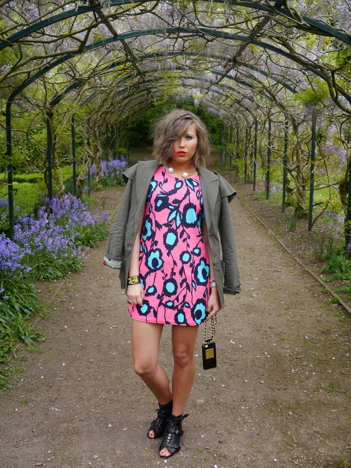 Это платье мгновенно “нарушило” серость нашей традиционной майской погоды своим контрастным цветочным принтом, который в сочетании с невероятно нежной структурой ткани придал моему луку весенней свежести и лёгкости. Оставаясь приверженцем рок чик стиля в любое время года, я решила добавить немного ” агрессивного драйва”, смешав люминисцентные цвета платя с холодным хакки жакета с Лондонского винтаж маркета и ” гладиаторской платформой” Kurt Geiger Carvela туфлей. И, конечно же, хит этого сезона – коралловая помада Lady Danger от MAC – идеальное завершение моего наряда!