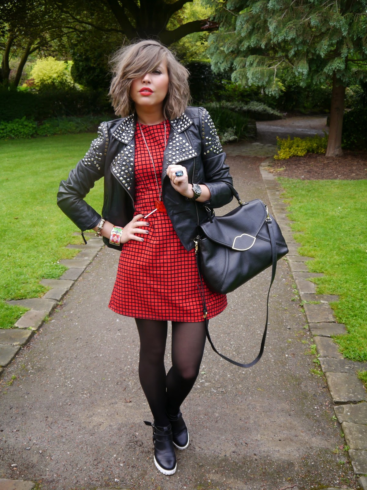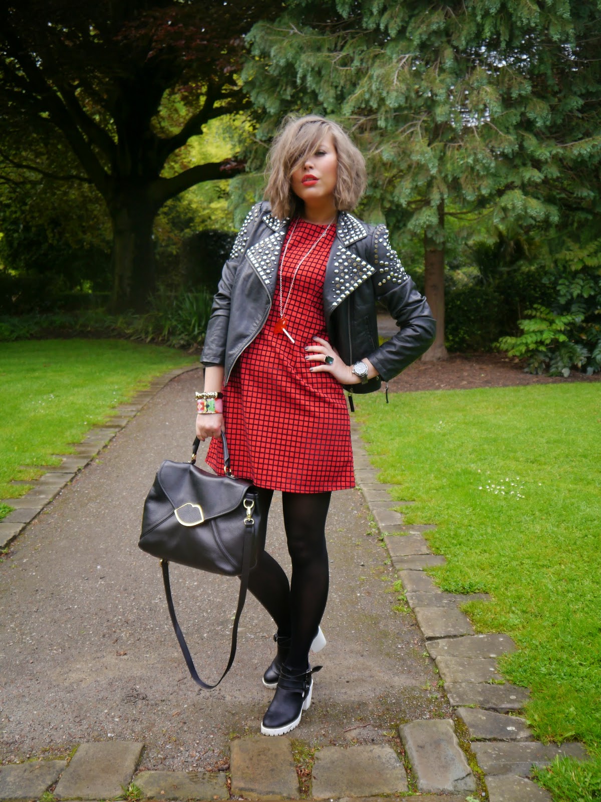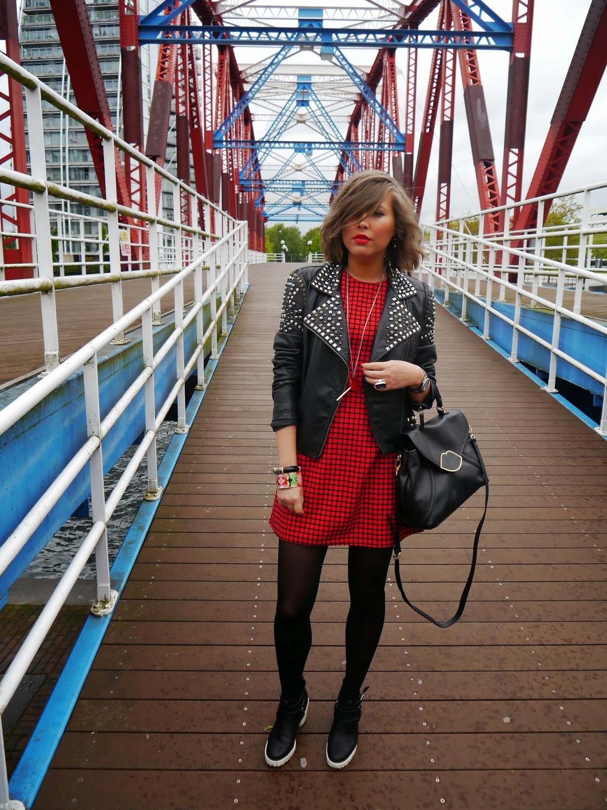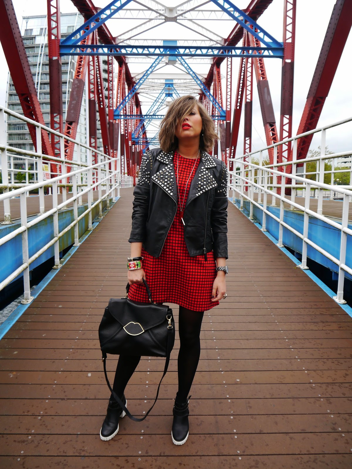 It was a very windy weekend here in Manchester, so we shoot my looks in two different locations trying to escape from the apocalyptic weather. First was my favourite red bridge in Salford Quays, (where I nearly got blown away) so we shortly moved to my secret location where I take most of my pics for the blog. Once I saw this Izzy Red Squared Flare Dress on the website an idea of styling it in a ” rock chick ” way was born straight away, so I paired it with my very “Alexander McQueen ” style studded jacket from Miss Selfridges that I bought 3 years ago and added one of my new bags by Lulu Guinness to give the look a bit of quirkiness. I still cannot cure my maniac obsession with the Lulu’s lips but hey, what could be sexier and more desirable than her bags? Maybe only Chanel ones :). My new bracelet Flor Amazona from http://www.secretdor.com/ by Colombian designer Ana Maria adds a hint of exotic mystery to the outfit’s radical colours.