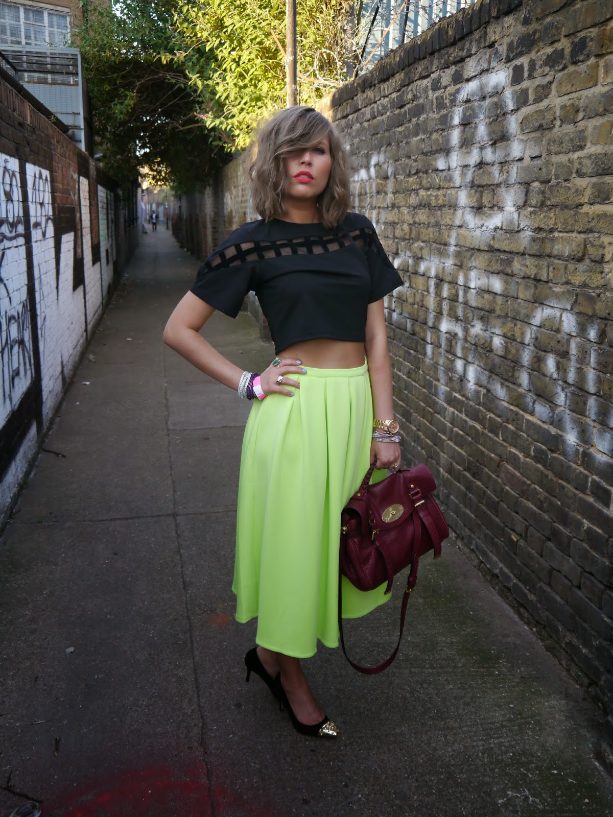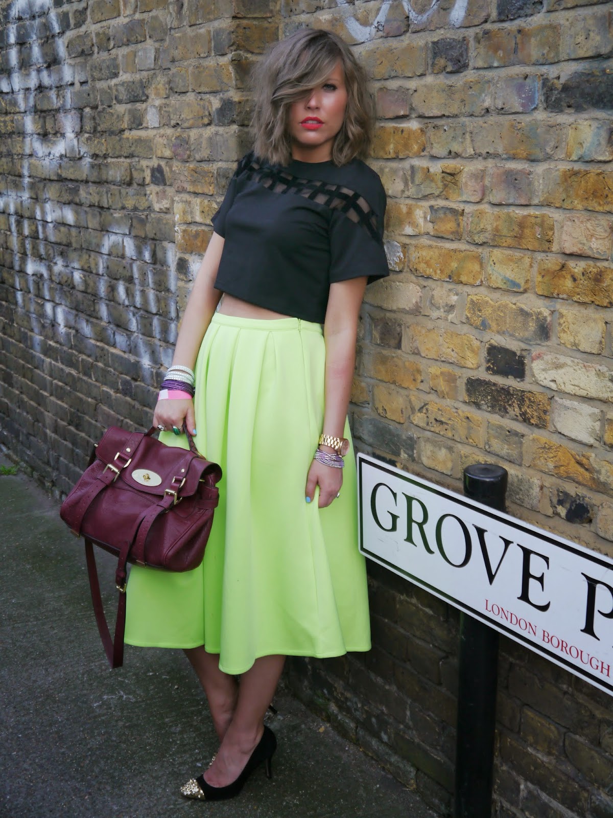 Hello hello my fashionistas ! I have new pics for you today. This outfit, which I had chosen from Missguided web, http://www.missguided.co.uk/ has kindly been sent to me by their PR. I have worn it for Company Blog Awards last moth and been asked a lot where my skirt was from. I am in love with this neon lime colour skirt and length of it. You can combine this beautiful piece with heels or pumps depending on the occasion. This crop top is also by Misguided and is quite unique due to its mesh panes. Also, that was a perfect event for showcasing my new Mulberry Alexa bag. I wanted it for soo long and is finally mine! I adore this “new classic” bag which you can pair with any outfit really. The night was unforgettable and I had a fantastic time. I’m wishing you all a great week ahead!