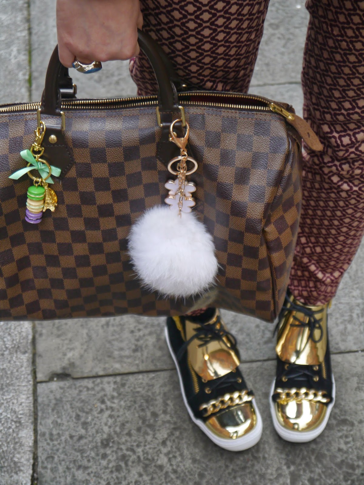 When it was still not as cold as it is now ( just two weeks ago!) I shoot this look. I’m wearing my new hitop trainers /boots by Jeffrey Campbell that I got at office HERE Jeffrey’s creation is a modern take on simple trainer – he added gold metal toe cap and front plate detail with chain across the toe which resulted in something ” intergalactically” glamourous) My trousers are from H&M current season and I love their 60’s pattern, they can be worn with heels to a night out or just be a perfect ” ingredient” for a casual look like mine . This jumper I got while in Spain and I adore its retro futuristic “back to the future” style print; it’s very 80’s and takes us back to the era of Sega Mega Drive games and nostalgic Star Wars episodes while its shiny sequin shoulder patches remind me of some flamboyant New Wave artists outfits. This piece can be easily paired with heels and clutch for a night out or trousers/jeans and boots for a casual day. For this outfit I used lots of my signature accessories and my LV Speedy 35 bag. ( my favourite one from my vast collection of bags) I love it for its classic design and Damier Ebene print, it makes a perfect combination with another Louis Vuitton creation – my gorgeous Monogram pattern shawl which is soft and warm due to its mixture of silk and wool. Signed Louis Vuitton Paris its style is very feminine, subtle and timeless and it’s just ideal for everyday use.