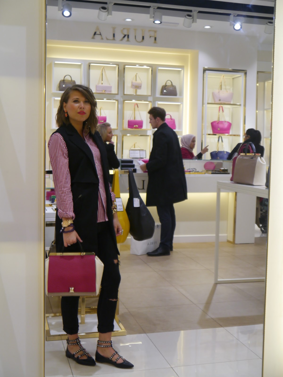 Hello my lovely readers! My today’s blog post about an amazing Italian brand Furla and my recent visit to the brand’s shinny store located at Cheshire Oaks Designer Outlet HERE . On Tuesday I was very lucky to be invited by the outlet’s lovely team to visit Furla store and choose a bag to style in 3 different looks. If you are not familiar with the brand, it is time to discover this season hottest Italian bags and to fall in love with the Candy collection (coloured “jelly” bags), Pipper bag Here and Furla Fantasia SS16 maxi clutch Here , they are too cute to pass up! If you’re a Furla loyalist, you will be pleasantly surprised by the new collection, which features lots of textured leather, and gorgeous colors, staying true to the brand. There’s something for everyone at the store, including mini handbags, keychains, belts, and shoes. I was spoiled for choice but with the help of the friendly staff ( special thank you to Zoe) I finally decided to take home Furla Cortina leather top handle satchel. It is a super classy leather bag which I also had seen on Olivia Palermo. I can’t wait to style it and show you all my looks here! Also stay tuned for my giveaway which I will announce next week! Just in time for Christmas you can win a Furla bag!! Thank you for stopping by, I’ll speak with you all in my next blog post.