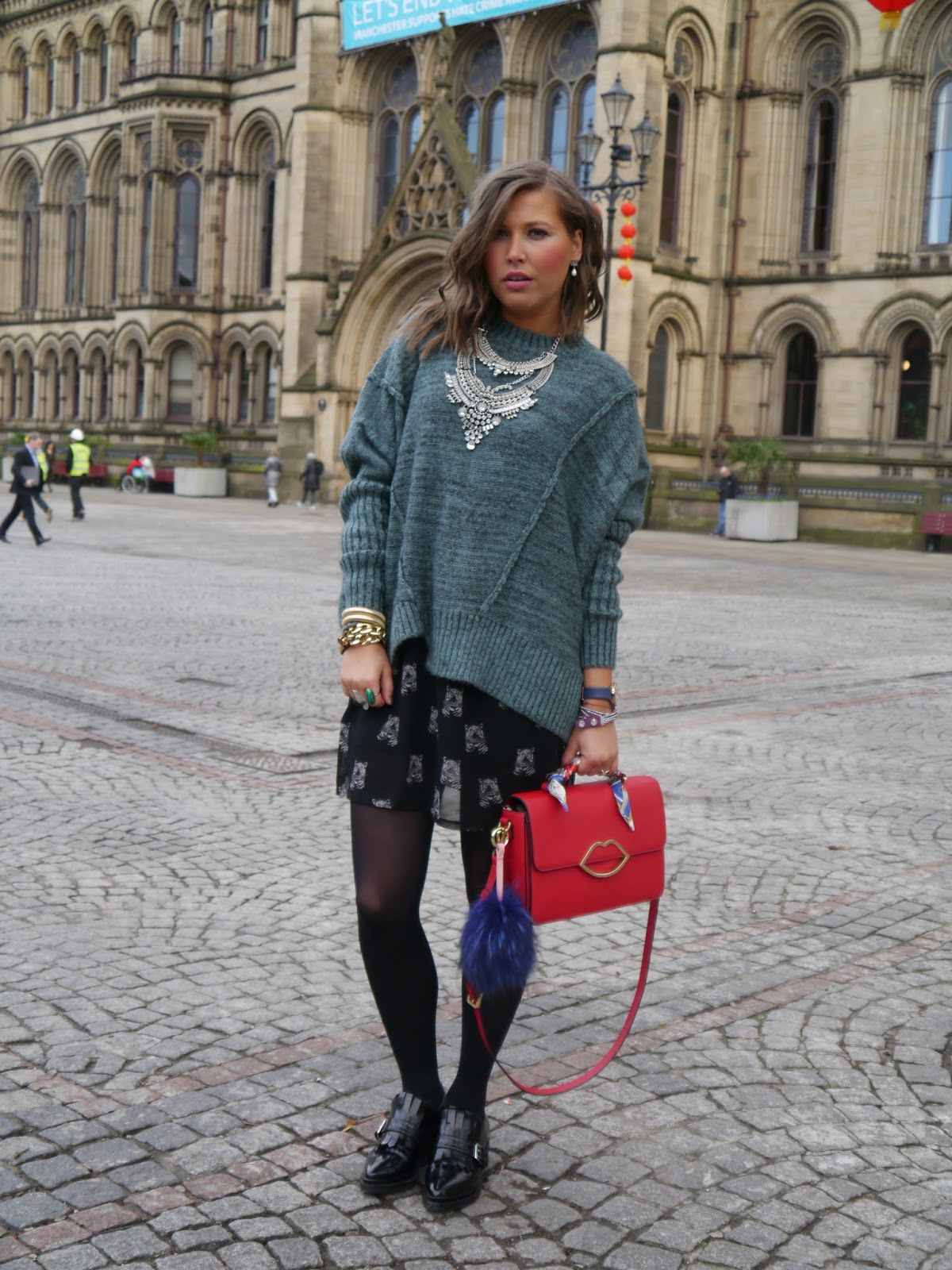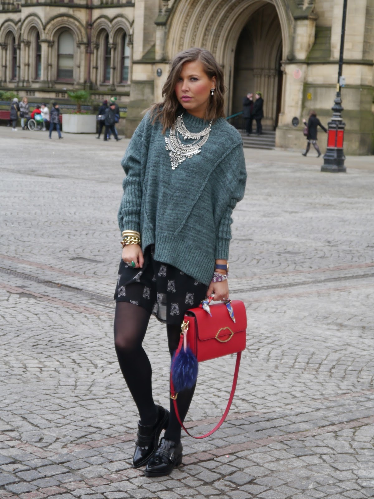 Don’t you just love statement necklaces? As you know me I can’t style an outfit without one. It’s been a huge trend for a while now, and it seem like it’s not going to fade away any time soon. And for good reason, the right statement necklace can bring any outfit to the next level. A really glam one can transform a plain outfit into something special, while a particularly large piece might be the only accessory you need to add in order to give a lot of edge to your OOTD which is the case with my today’s look. I wore this cosy Label Lab slouchy soft & warm knit jumper in blue HERE and taking advantage of its simplicity I added a big statement necklasse which instantly transformed the look without “overaccessorising”it. This massive bling neckless is by Happiness Boutique HERE which suited this look perfectly. This red crosshatched Saffiano leather Edie Cross body bag bag is from my collection by Lulu Guinness (sold out but a similar style is available HERE )This bag is for sure a show stopper. Every time I wear this masterpiece I get asked the same question “Where is this bag from??” My Lulu bags always make a perfect accessory for any of my outfits. I hope you liked my look and I will speak to all soon x