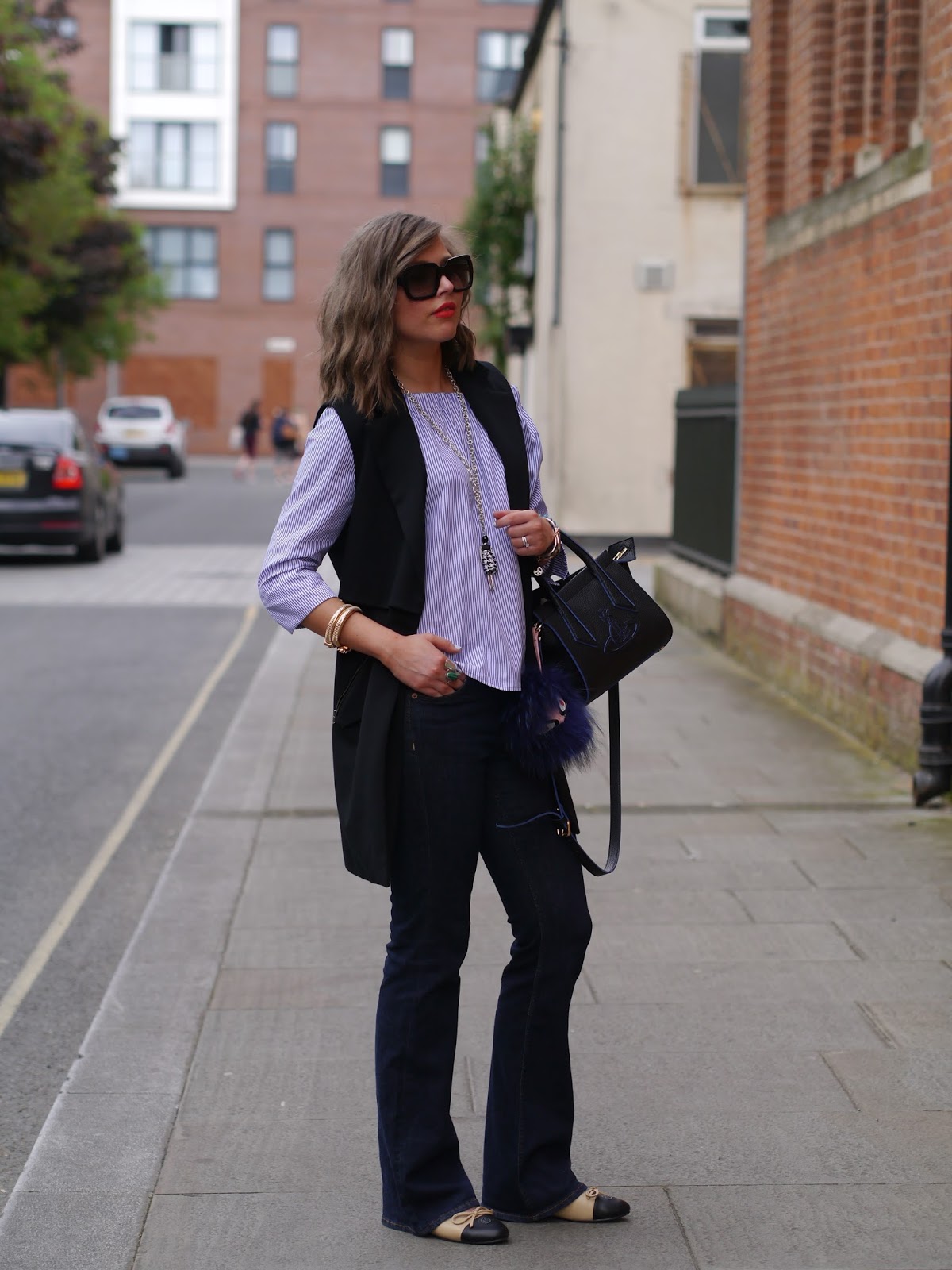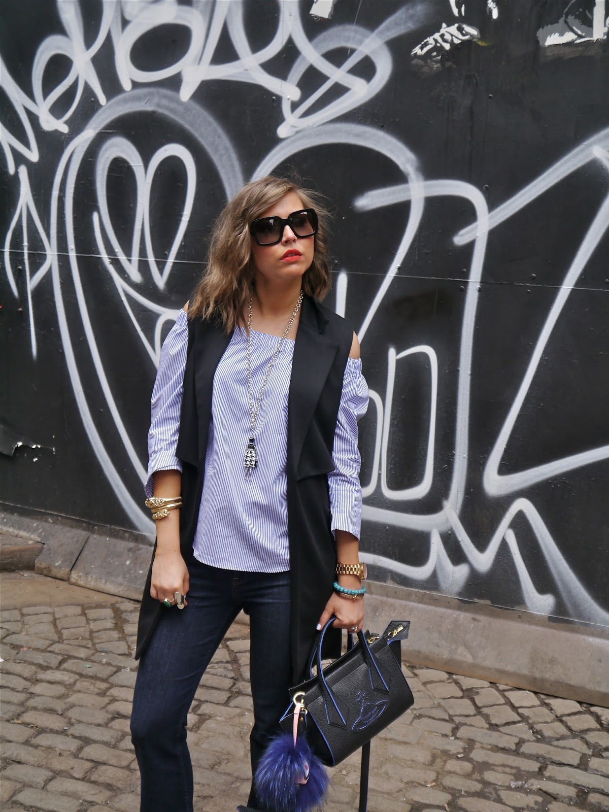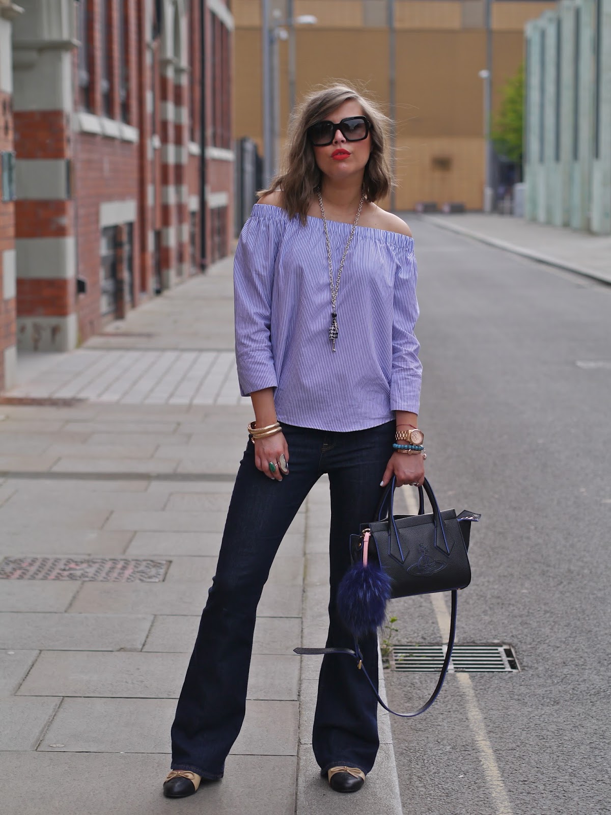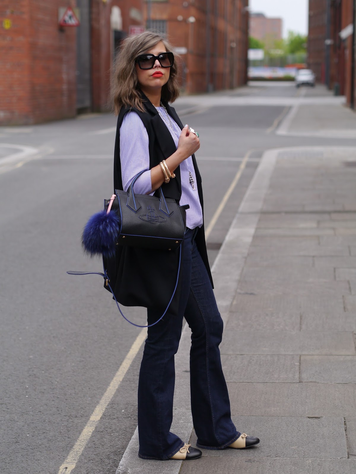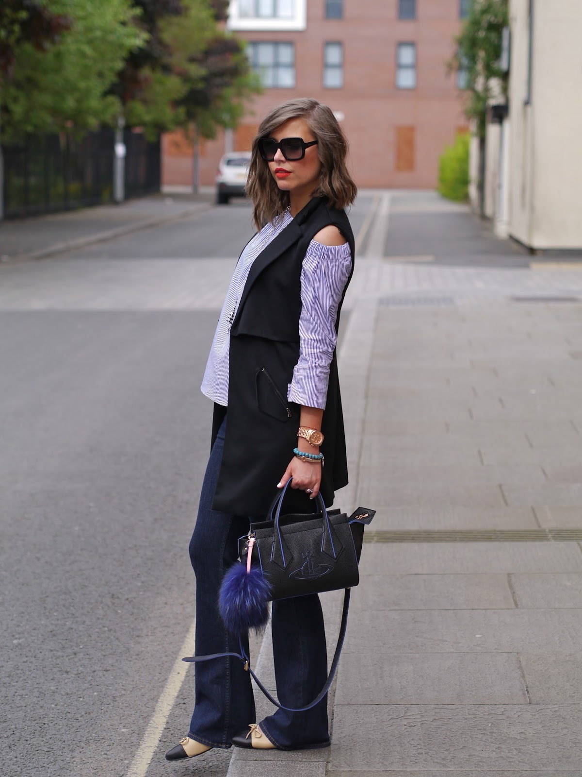 I’ve been wearing my off shoulder top with boyfriend jeans and skirts, but I have to say pairing it with my favourite pair of flare jeans from H&M gives it a whole new look. I layer this versatile sleeveless duster from Primark over my outfit to keep my style on point. In a light weight crepe fabric, its an easy to wear day to night. You can also style it over skinny jeans and skyscraper courts for a sharp take on this season’s tailoring trend. To complete my look I added timeless Vivienne Westwood Venice beach bag and Prada sunglasses.
