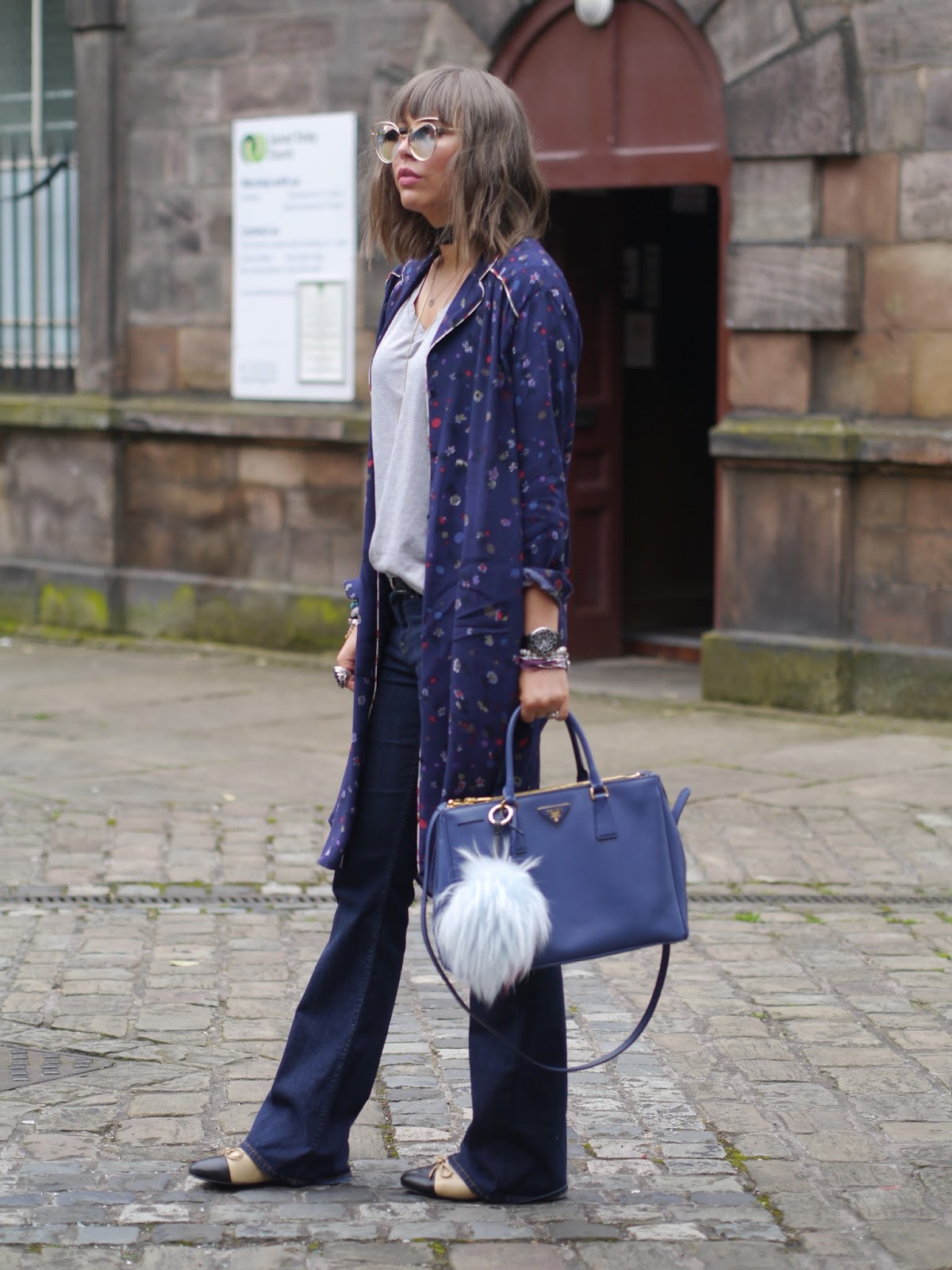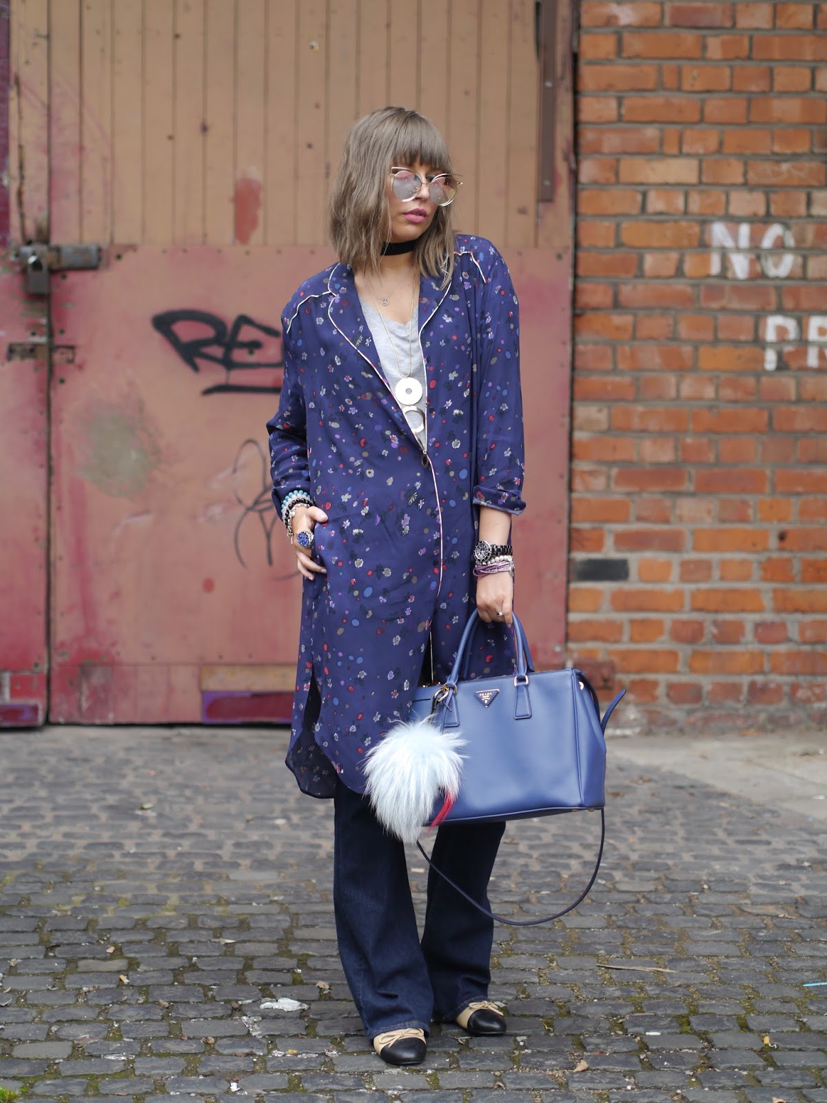 One of the biggest trends this summer is “nightwear as daywear” and I decided to feature this Pyjama shirt in my today’s blog post. I picked this long loungewear style elongated shirt in Zara sales for just£7.99. I mixed it up with retro style flares from H&M to give my look a sixties swing vibe. Although we wouldn’t argue with a fashion trend that privileges comfort, I have to admit the idea of wearing pyjamas during the day still feels a bit too “radical” to me and if you are not brave enough to wear a whole set of silky shirts and matching, slim-fit trousers you can just try to start mixing your daily outfits by adding “nightwear ” style shirt or trousers to your look separately like in my case, my ootd looks both effortless and polished at the same time. While this trend might sound low maintenance, it’s actually kind of the opposite, I spent quite a while in front of the mirror before my ootd started looking both effortless and polished at the same time. I added my summer go-to Prada bag in cornflower blue and Chanel flats as final touches of perfection:)