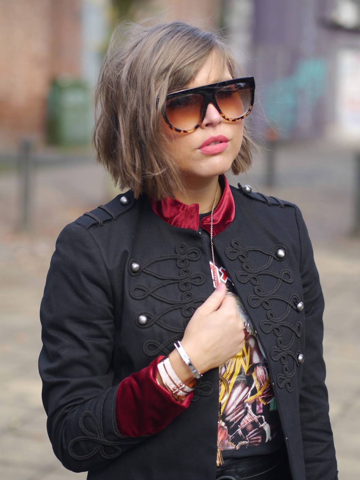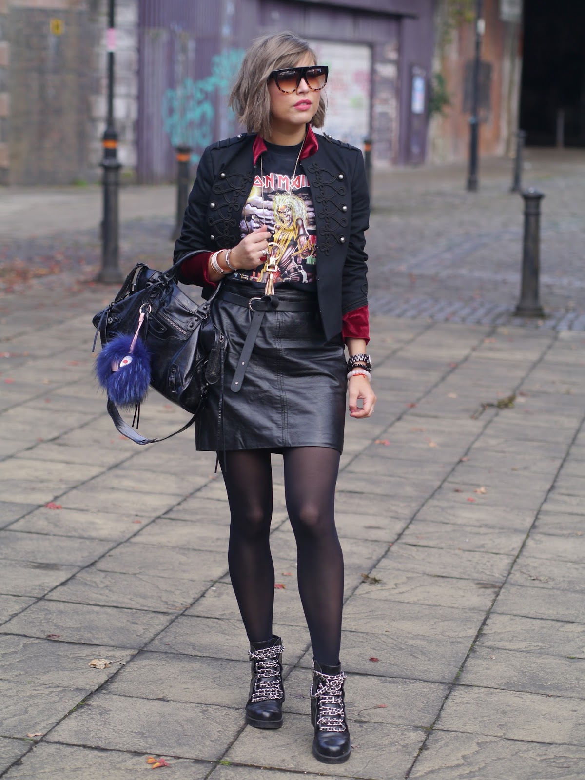 Military style jacket is here to replace your bomber this fall. We all know that the military blazers/jackers been influencing fashion since the ’60s when Yves Saint Lauren introduced his iconic Saharienne jacket. The only difference between jackets then and now as we’ve seen on the catwalks at Gucci, Burberry and Givenchy is that they seem plucked not from the army surplus store, but from 18th-century Britain and France. How to wear them? Well, treat your military style blazer the same as the leather one, it does go with anything, even layered over a shirt and skirt, to give my look a bit of a rock chick feel ( I purchased my military jacket from Stradivarius last weekend) I added a music band tee to it. As you know, vintage band merch has become a must-have fashion accessory this summer and this trend continues into Fall. I wore my 10 years old (which makes it officially vintage) Iron Maiden t-shirt which suited the look perfectly. Accessory wise my new Balenciaga bag with pom pom was an ideal piece to complete my look.