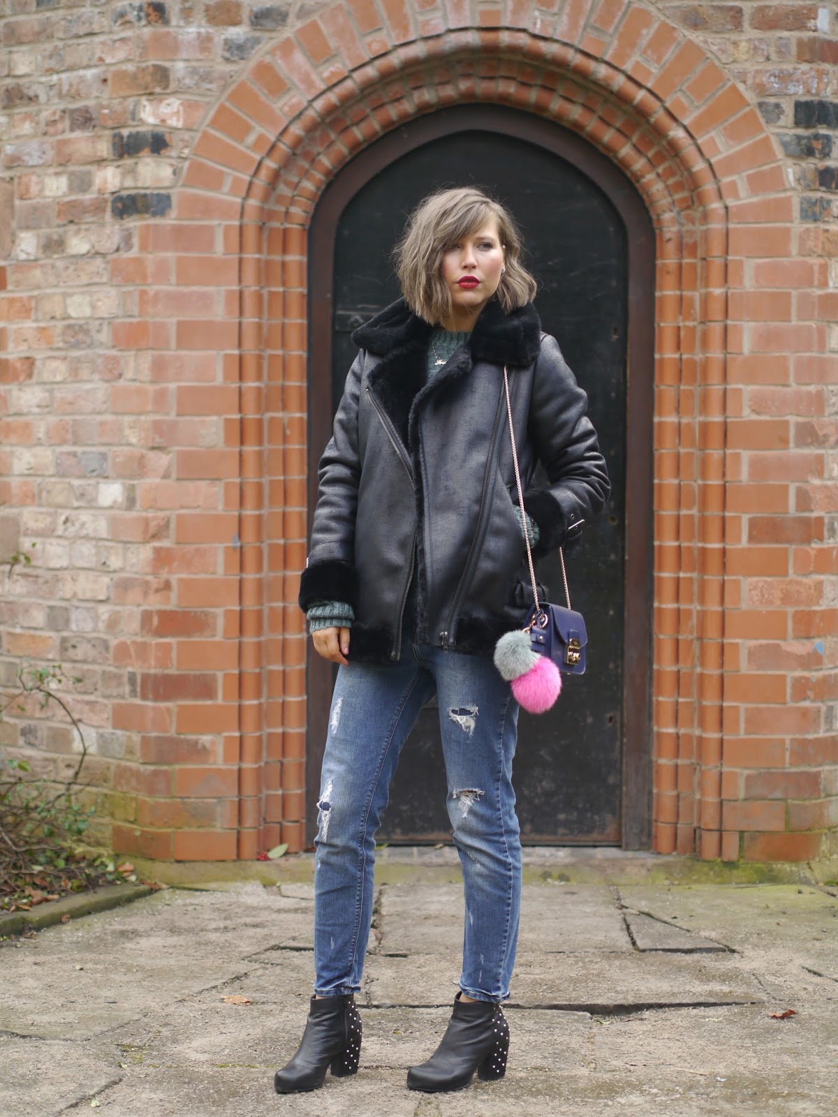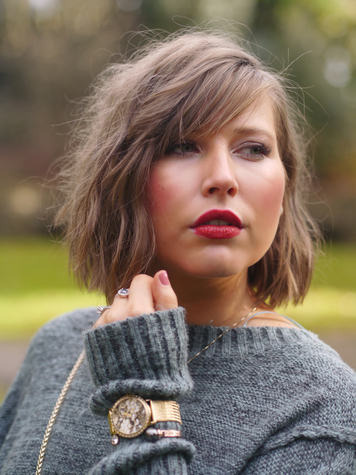 Thanks to warm weather in the UK I managed to shoot this look. I simply can’t stop wearing my new oversized biker jacket by Warehouse which I featured in my my previous look , this jacket keeps me warm plus its classic style goes with everything. This chunky knit is from Label Lab (this model is sold out, similar here) it’s an essential item in my winter wardrobe, I love its oversized shape & soft texture, its exposed seam details ribbing around the sleeves, hem and neckline, makes it unique and edgy. The jumper’s soft handle style makes it extremely comfortable to wear. I want to mention my new accessories from Guess – this absolutely gorgeous Gold Plated mesh watch with floral dial, for a casual, yet feminine, sophisticated look and Rose Gold Pearl & Ctystal Bangle . As you all know accessories play a massive role in my looks and I can’t wait to style these two pieces for Christmas parties. As for my new lipstick which I’m wearing here, it has a perfect colour for Autumn/ Winter and no doubts it will be a must have lippy this festive season, it’s from Illamasqua in Rockabilly. I’m now obsessed with this colour, needless to say that Illamasqua lipsticks are super pigmented and long staying. I hope you all are having a fabulous Monday. Speak soon X