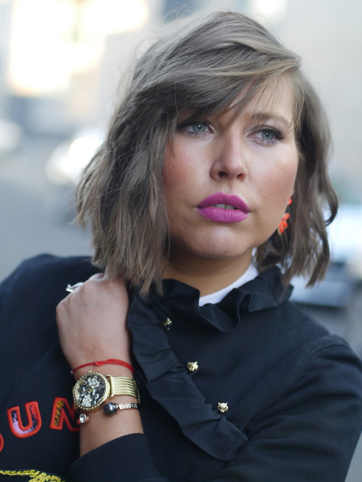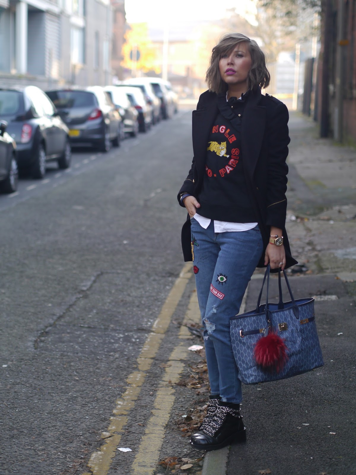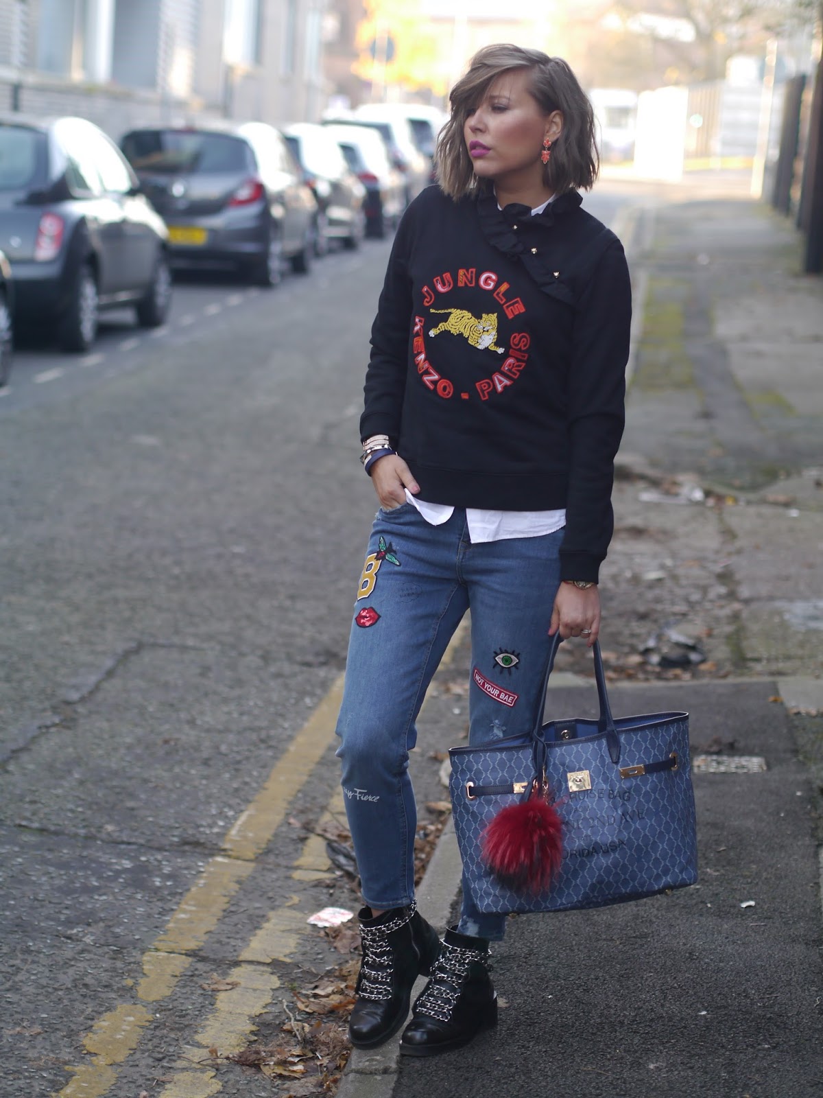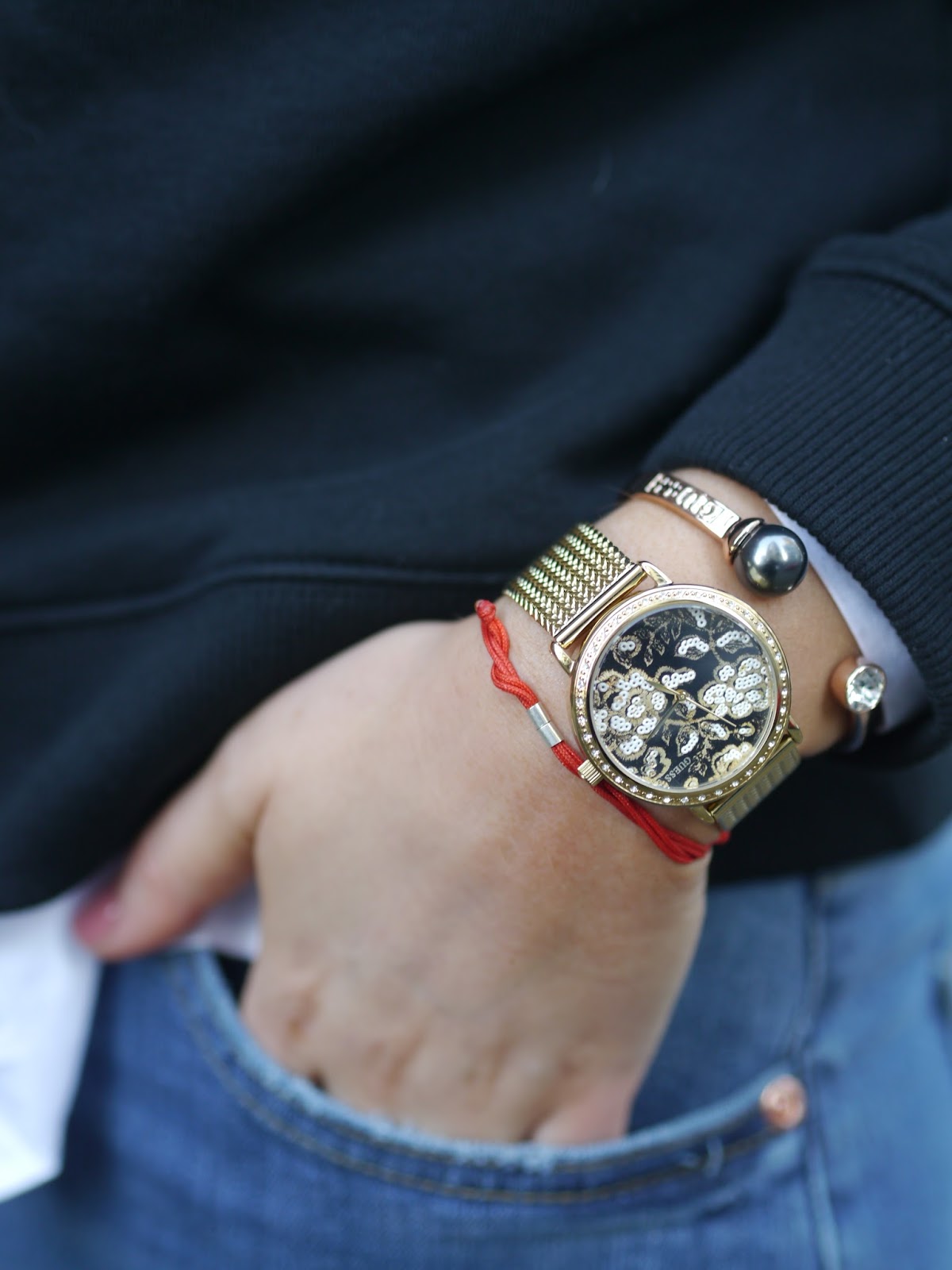 Hello my lovely readers, today’s post is about my latest look that we shot in the cold wintery streets of Manchester. As you all know, to get the latest H&M collaboration with Kenzo I flue to Germany (which goes to show once again how obsessed I am with my favourite brands:) The new collection is bold and colourful aiming at more daring fashionistas like myself. These Jungle sweatshirts by Kenzo were undoubtedly the pieces that stood out for their striking embroidered logo and angled ruffle detail, that is why I decided to get them in both colours (I featured the same jumper in orange in my previous blog post ) It’s a piece that anyone can style. I paired it with my new boyfriend jeans with glittery patches by H&M and V73 tote bag. My accessories were from Guess – this absolutely gorgeous Gold Plated Mesh Watch with floral dial, for a casual yet feminine, sophisticated look which made an ideal combination with Rose Gold Pearl & Ctystal Bangle. Your perfect accessories for Christmas! I hope you all are having a fab week. Speak soon X